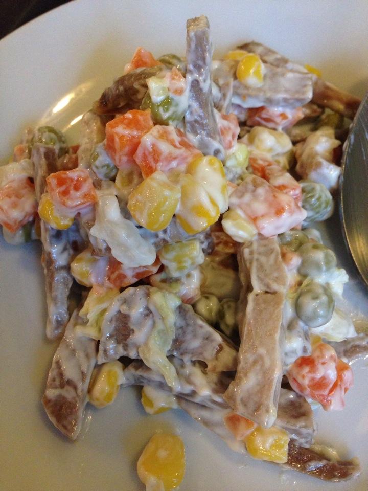 Салат с языком вкусный 👍 язык, вареная морковь, кукуруза, горошек мммм